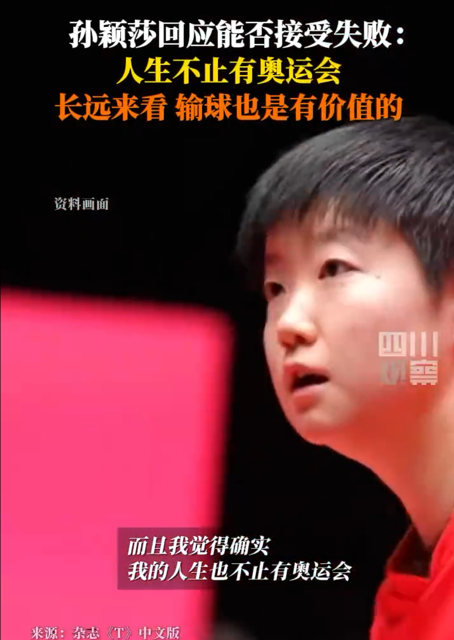8月28日,接受杂志《T》中文版采访时,孙颖莎谈及“能否接受失败”:“我的心结要能够打开,我才有信心在新的周期里再去竞争。说实话,挺难的。一开始,你确实没有办法完全接受自己的失利。但是随着时间流逝,慢慢地,我觉得我也接受了。而且我觉得,确实,我的人生也不止有奥运会。哪怕我现在比赛输了,他们也依然能够在我身上看到这种正向的能量。一想到这里,我内心就没有那么纠结于胜负。”
